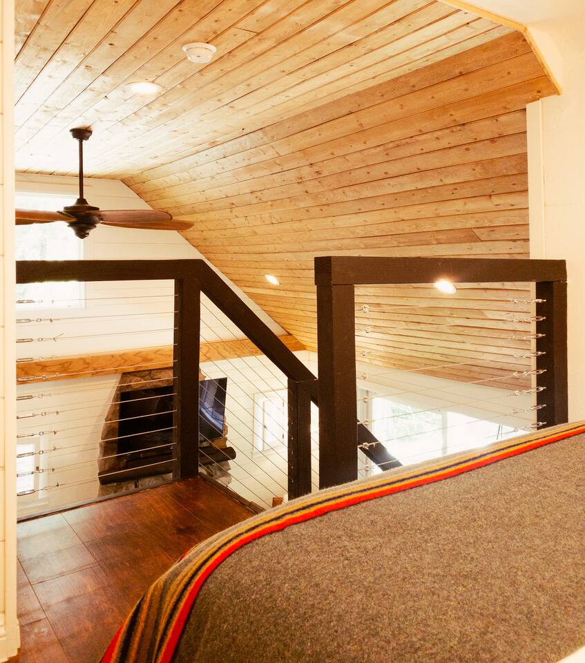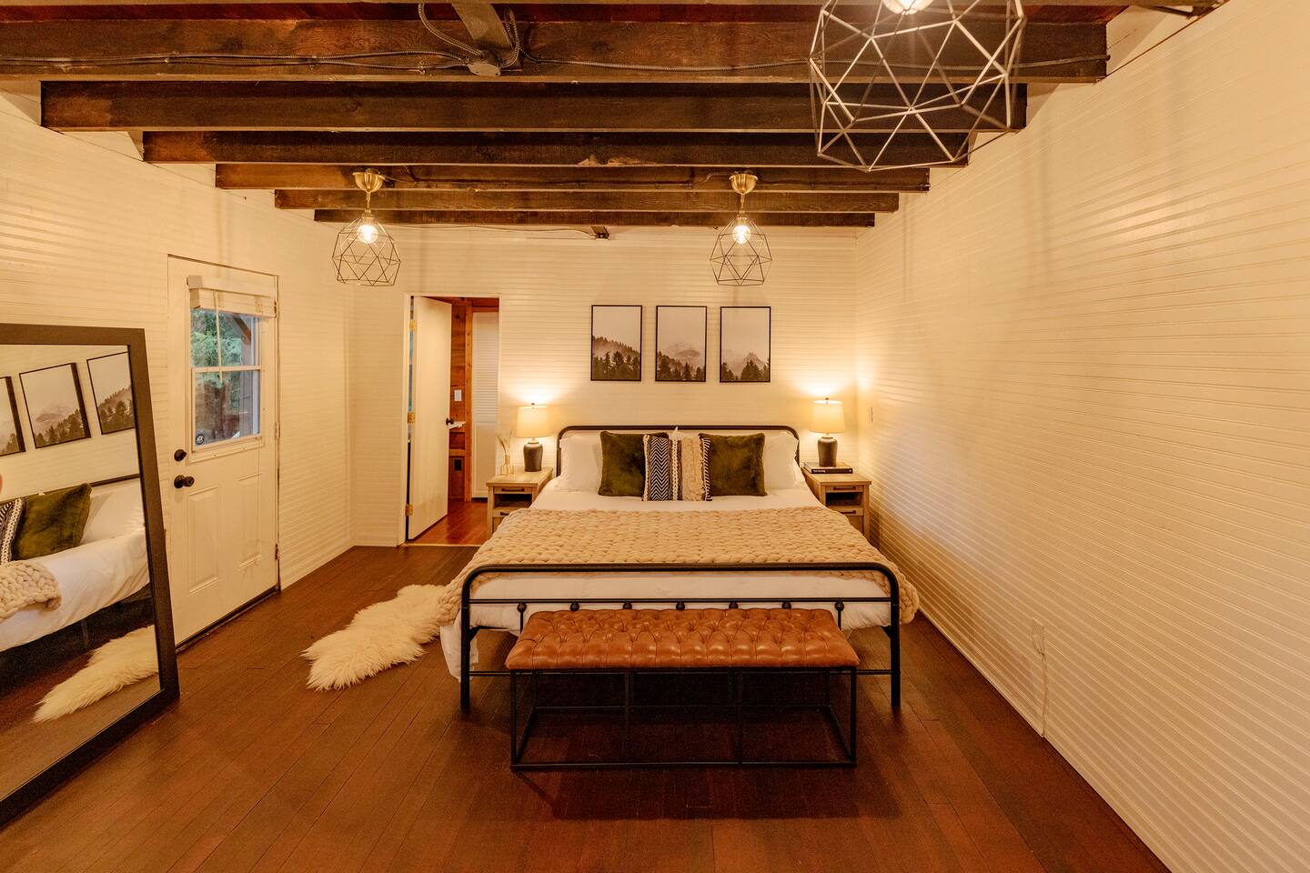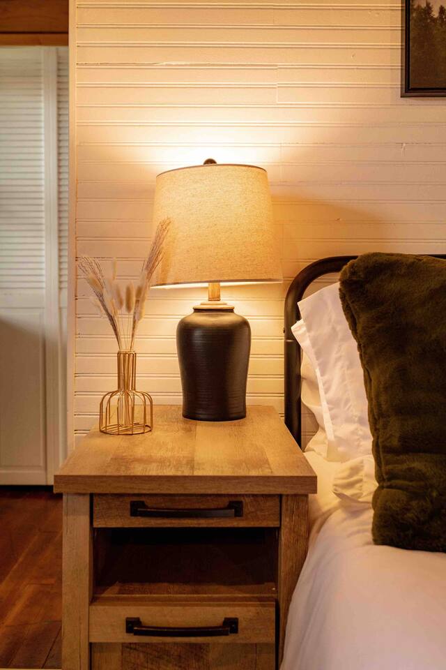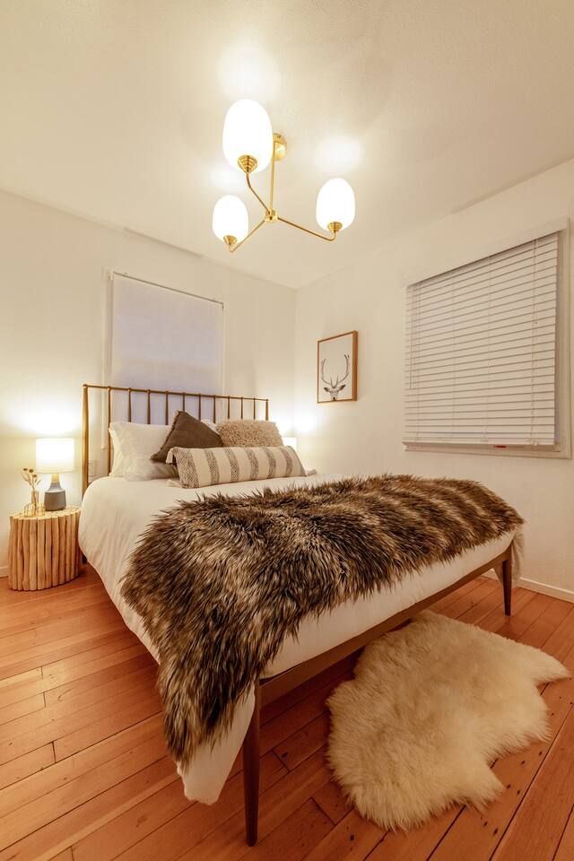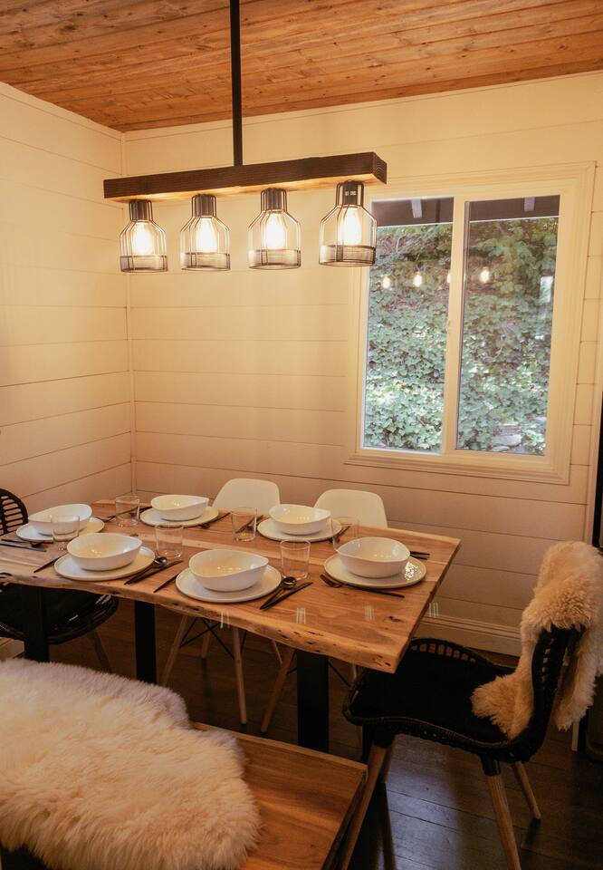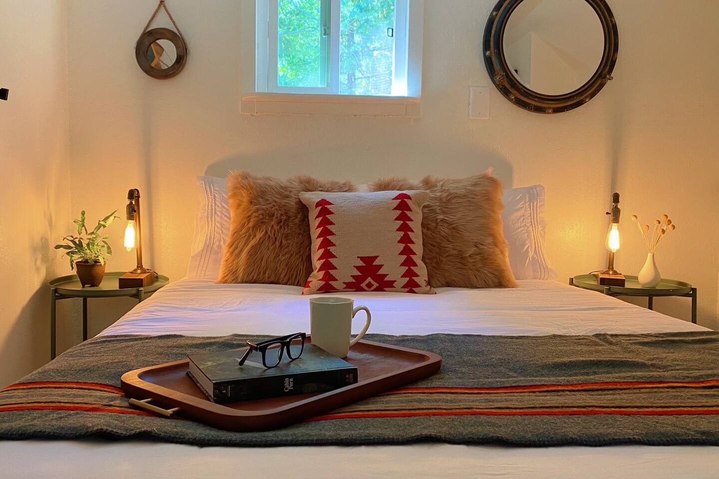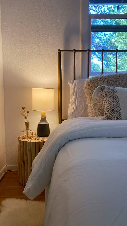 The open concept living room with vaulted knotty pine ceilings and an original masonry fireplace with a wood-burning stove set the mood for cozy and intimate evenings, sharing stories or playing games while listening to a few classic records. Make your way into the gourmet kitchen where you’ll feel inspired to create delicious meals together, or whip up your favorite cocktails to sip at the bar while someone else cooks! Fully equipped with a built-in stove top and a separate wall oven and microwave, the kitchen has all the accessories you might need. A full coffee & tea station is provided to start your mornings off right. The cozy and inviting Scandinavian-inspired dining room creates an intimate mood where we hope you’ll make wonderful memories with your favorite people. Step outside onto the main floor back deck where you’ll be immersed in the sounds of the forest while taking in the breathtaking view. A perfect place to connect with nature and recharge. Hang out by the chiminea and enjoy the fire vibe over a glass of wine, or grill and dine under the pines. Morning sunrises while enjoying a cup of coffee are one of the many highlights of the lodge. Experience ultimate relaxation in our luxurious private hot tub on the front patio. Nestled among the pines, this haven offers the perfect blend of serenity and indulgence. Unwind as the warm, bubbling waters melt away your cares, while you soak up the crisp mountain air and starlit skies. Whether you're seeking a romantic escape or a tranquil getaway, our hot tub oasis promises an unforgettable, rejuvenating experience amidst nature's splendor. Take your choice of 3 bedrooms. Head up to the loft for a camping-by-the-lake vibe with an open concept and queen-sized bed or enjoy the main level “wolf den” with a modern yet woodsy vibe, located next to the main level bathroom. Head downstairs to the primary suite with an abundance of space and a beautiful masonry stone fireplace with an electric log set for the ultimate mood. The room is equipped with a desk with a forest view, whether you're in need of a work station or want to stir up your creative juices. Cozy up in the king-sized bed, enjoy the privacy of your own back deck while taking in the fresh air, and relax in the large soaking tub in your en-suite bathroom which also includes a double vanity and spacious closet. For those warm summer days, there is an evaporative cooling unit in the dining room, a large ceiling fan in the living room, as well as a floor fan in each bedroom. Once winter arrives, the lodge is equipped with a new and efficient Rinnai wall unit in the master bedroom connected to a Nest thermostat that is capable of heating the entire house, however, there is also an additional wall heating unit on the main floor as well as the wood stove which heats the house up quickly. Firewood is provided for our guests. The lodge is fully set up with Alexa and smart plugs. Turning on inside and outside lights is as easy as a simple command. Start up the record player for an old-fashioned music experience or bluetooth to the sound bar to listen to your favorite tunes. All lights are on dimmers to make sure you are able to create that perfect mood. Check us out @littlewolflodge for more info and photography!