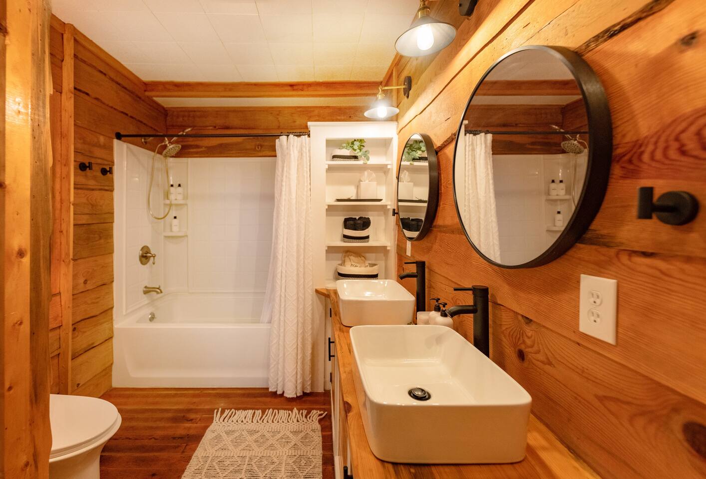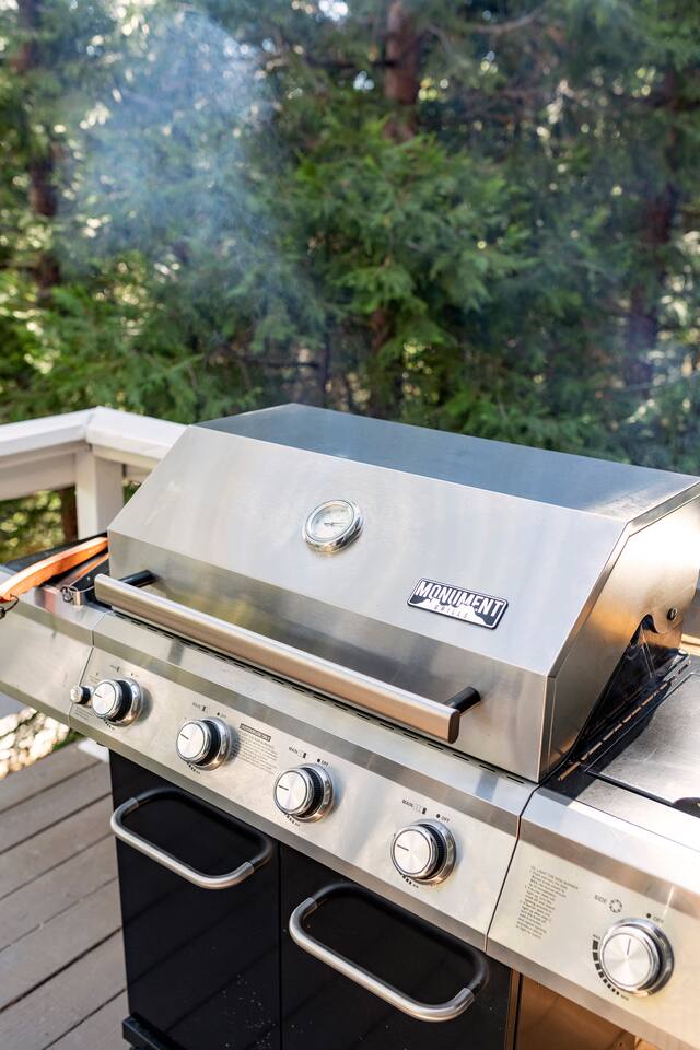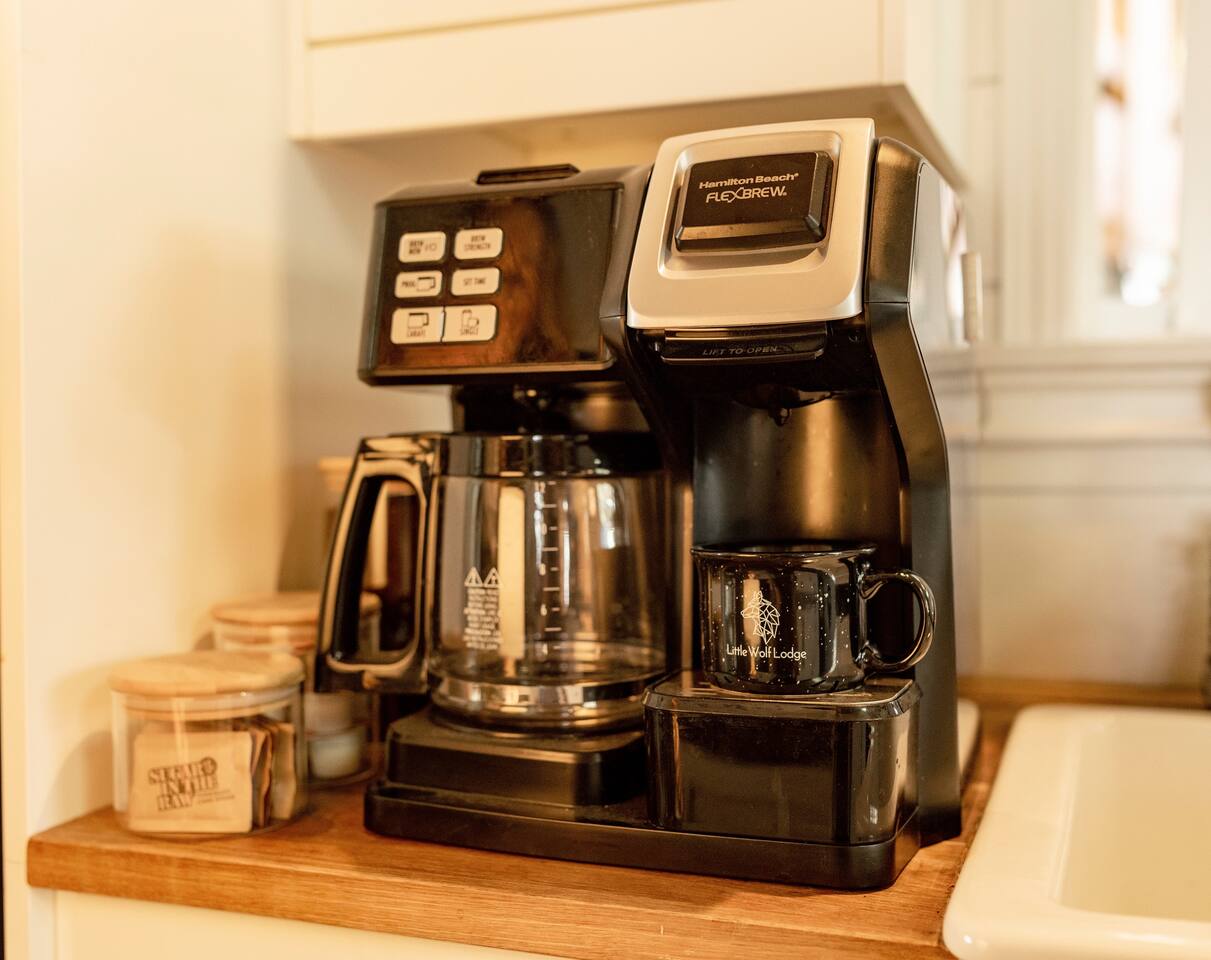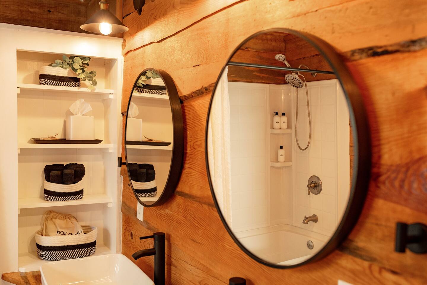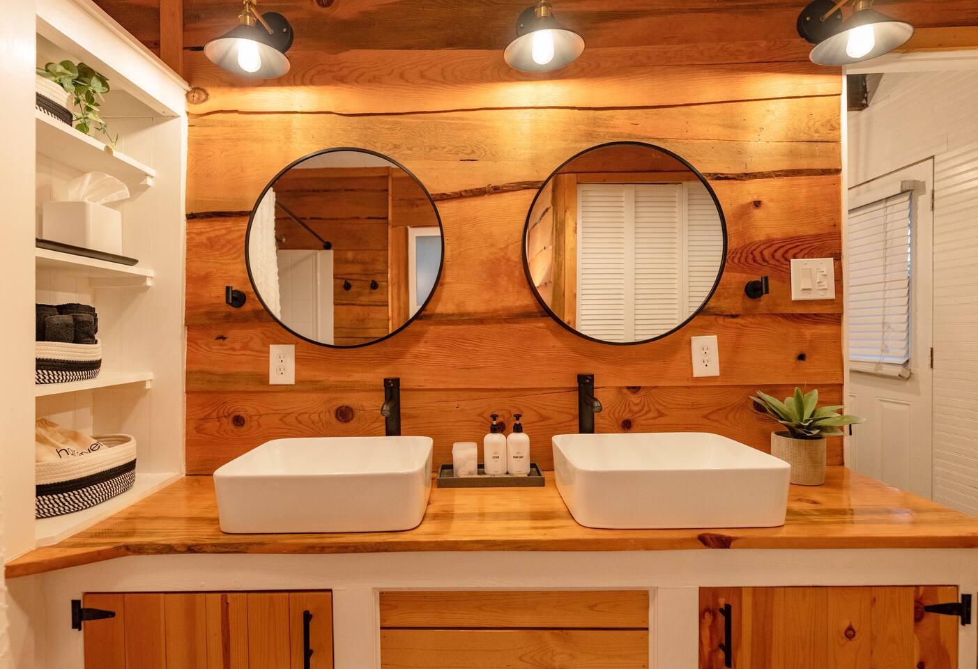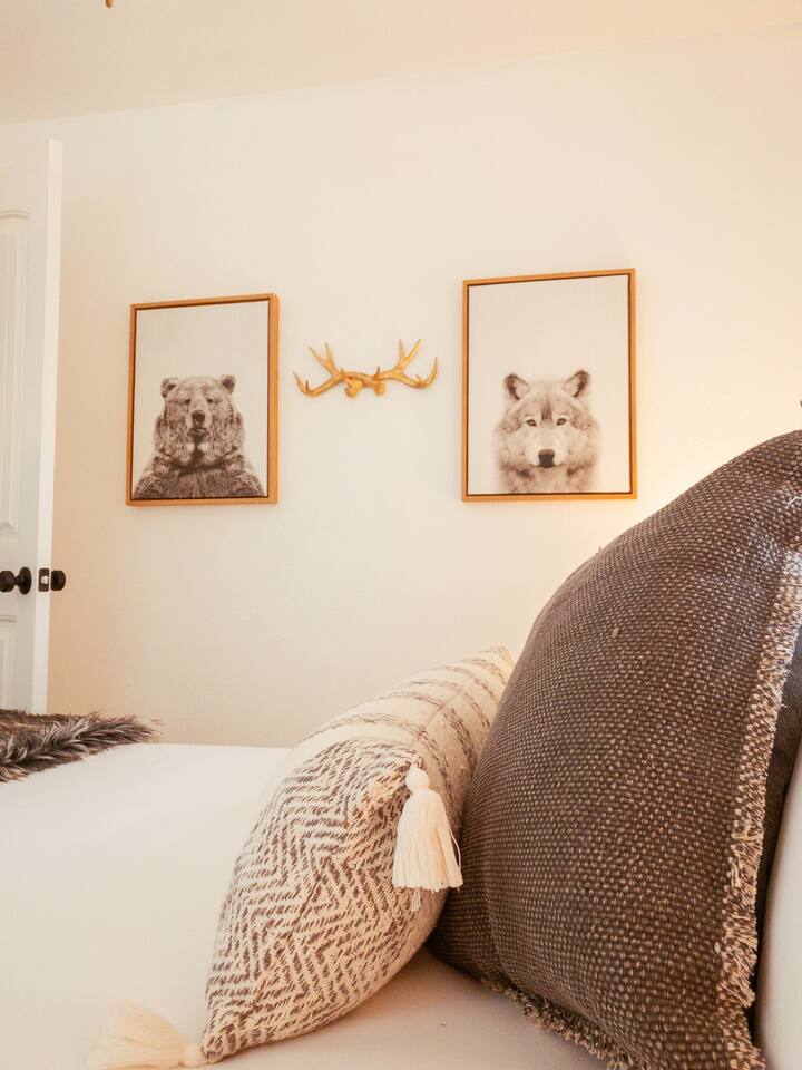 The open concept living room with vaulted knotty pine ceilings and an original masonry fireplace with a wood-burning stove set the mood for cozy and intimate evenings, sharing stories or playing games while listening to a few classic records. Make your way into the gourmet kitchen where you’ll feel inspired to create delicious meals together, or whip up your favorite cocktails to sip at the bar while someone else cooks! Fully equipped with a built-in stove top and a separate wall oven and microwave, the kitchen has all the accessories you might need. A full coffee & tea station is provided to start your mornings off right. The cozy and inviting Scandinavian-inspired dining room creates an intimate mood where we hope you’ll make wonderful memories with your favorite people. Step outside onto the main floor back deck where you’ll be immersed in the sounds of the forest while taking in the breathtaking view. A perfect place to connect with nature and recharge. Hang out by the chiminea and enjoy the fire vibe over a glass of wine, or grill and dine under the pines. Morning sunrises while enjoying a cup of coffee are one of the many highlights of the lodge. Experience ultimate relaxation in our luxurious private hot tub on the front patio. Nestled among the pines, this haven offers the perfect blend of serenity and indulgence. Unwind as the warm, bubbling waters melt away your cares, while you soak up the crisp mountain air and starlit skies. Whether you're seeking a romantic escape or a tranquil getaway, our hot tub oasis promises an unforgettable, rejuvenating experience amidst nature's splendor. Take your choice of 3 bedrooms. Head up to the loft for a camping-by-the-lake vibe with an open concept and queen-sized bed or enjoy the main level “wolf den” with a modern yet woodsy vibe, located next to the main level bathroom. Head downstairs to the primary suite with an abundance of space and a beautiful masonry stone fireplace with an electric log set for the ultimate mood. The room is equipped with a desk with a forest view, whether you're in need of a work station or want to stir up your creative juices. Cozy up in the king-sized bed, enjoy the privacy of your own back deck while taking in the fresh air, and relax in the large soaking tub in your en-suite bathroom which also includes a double vanity and spacious closet. For those warm summer days, there is an evaporative cooling unit in the dining room, a large ceiling fan in the living room, as well as a floor fan in each bedroom. Once winter arrives, the lodge is equipped with a new and efficient Rinnai wall unit in the master bedroom connected to a Nest thermostat that is capable of heating the entire house, however, there is also an additional wall heating unit on the main floor as well as the wood stove which heats the house up quickly. Firewood is provided for our guests. The lodge is fully set up with Alexa and smart plugs. Turning on inside and outside lights is as easy as a simple command. Start up the record player for an old-fashioned music experience or bluetooth to the sound bar to listen to your favorite tunes. All lights are on dimmers to make sure you are able to create that perfect mood. Check us out @littlewolflodge for more info and photography!